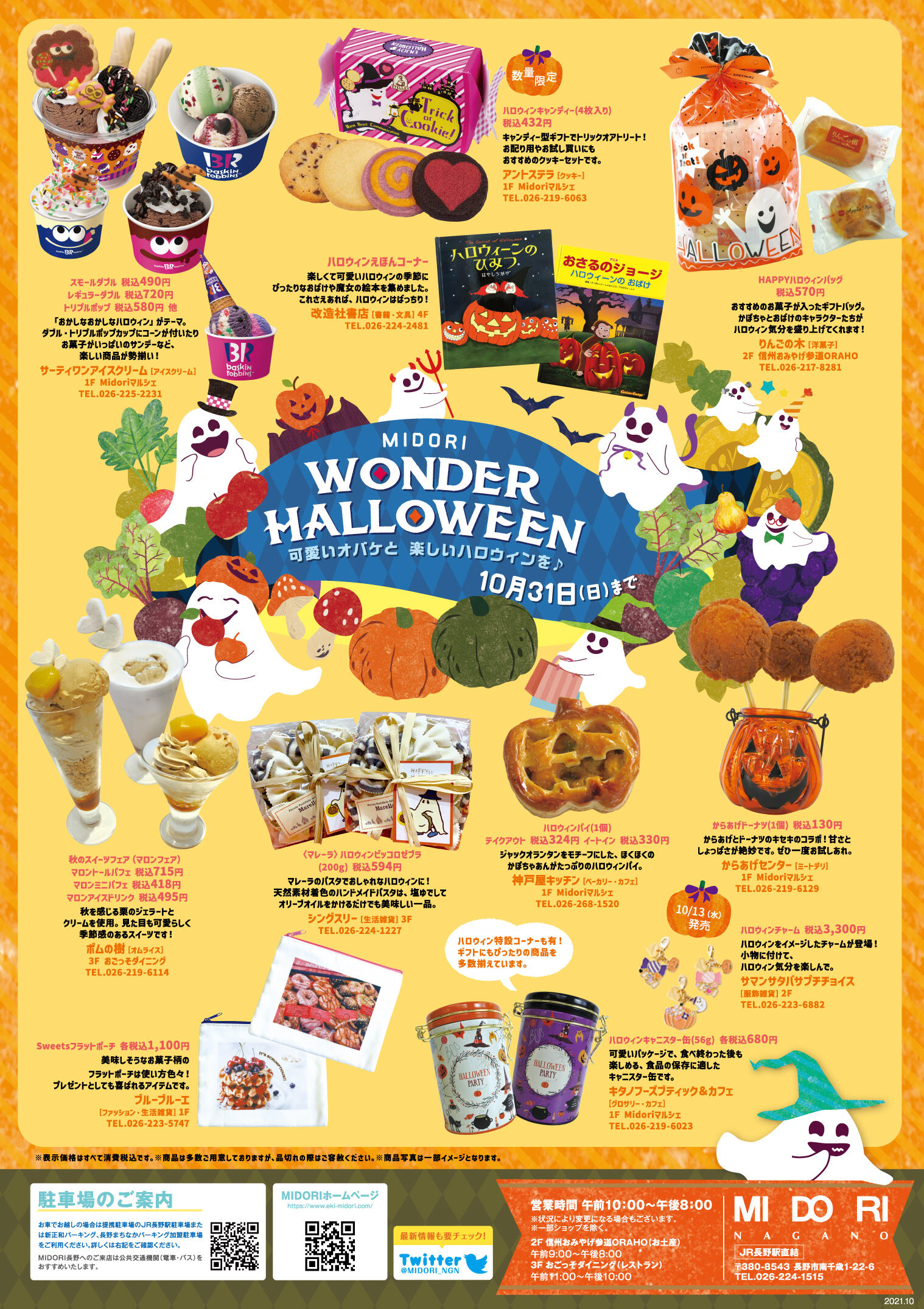 2021.10.20 MIDORI WONDER HALLOWEEN! MIDORI WONDER HALLOWEEN! ハロウィン気分をさらに盛り上げてくれるグルメやアイテムをご用意♪ MIDORI長野でお腹も心も満たされるハロウィンを! 詳しくは下記チラシをご覧ください。 チラシ1.jpg チラシ2.jpg