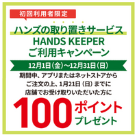 12月31日(日)までの期間中、初めて「ハンズの取り置きサービス HANDS KEEPER」にてご注文の上、1月21日(日)までにお買い上げいただいた方に、後日100ポイントをプレゼントします。ほしいものをまとめて注文しておけば、1ヶ所でまとめて受け取れるのでお買い物がラクラク!おトクな機会にぜひご利用ください!
