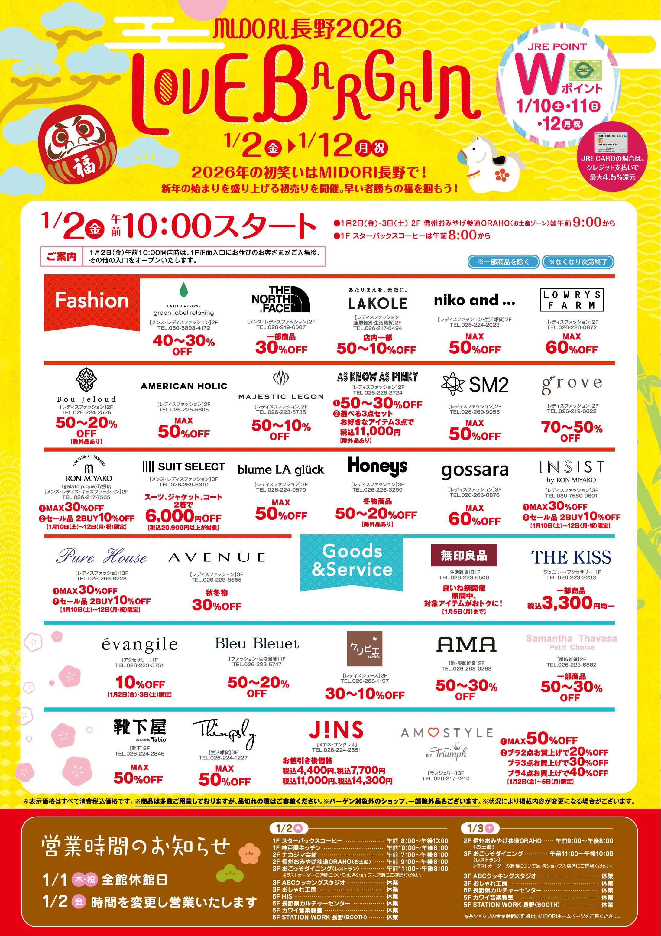 2025.12.31 MIDORI LOVE BARGAIN開催! 1月2日(金)スタート! 冬物一斉大幅OFFの MIDORI LOVE BARGAINが1月2日(金)からスタート! 福袋も多数ご用意しております! ぜひ、2026年のハジマリは、MIDORI長野で! くわしいOFF情報は下記をご覧ください♪ 26MIDORI_nagano_Bargain①.jpg 26MIDORI_nagano_Bargain②.jpg 26MIDORI_nagano_Bargain③.JPG