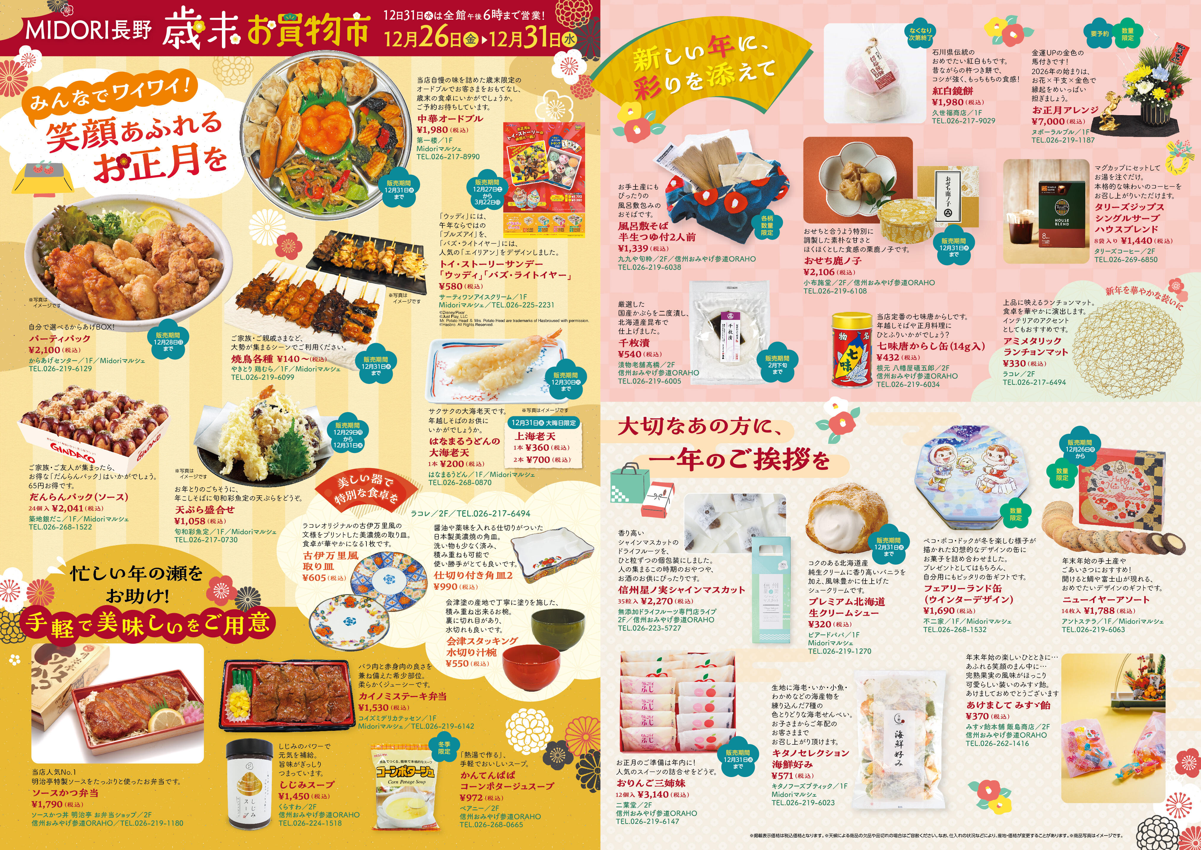 2025.12.25 12月26日より! MIDORI歳末お買物市開催! 年末年始のお買物は、ぜひMIDORI長野で。 特別なお年とりのごちそうや、 お年賀品など、多数ご用意しております。 御忙しい年末ですが、 笑顔溢れる時間をぜひMIDORI長野で お過ごしください。 ①歳末.jpg ②歳末.jpg